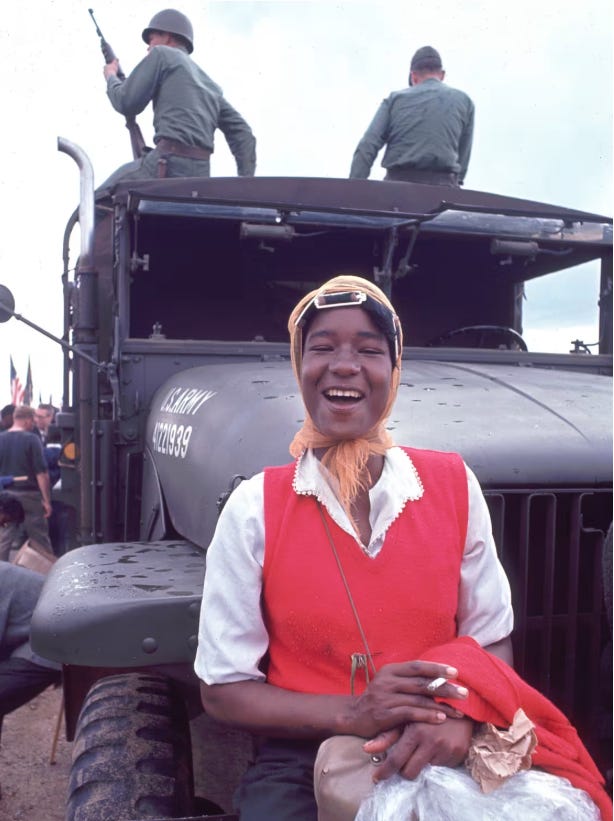 [Doris Wilson, 20, a resident of Marion, Ala., smoking a cigarette on the front of a military vehicle along the route of the Selma-to-Montgomery march in March 1965.]