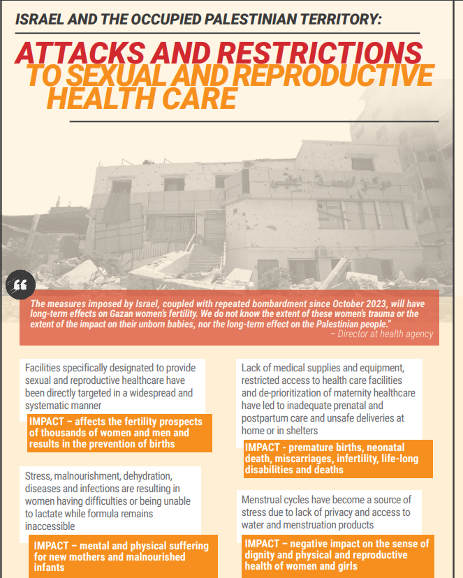 Women and girls have died from complications related to pregnancy and childbirth due to the conditions imposed by the Israeli authorities which have denied access to reproductive health care - acts which amount to the crime against humanity of extermination.