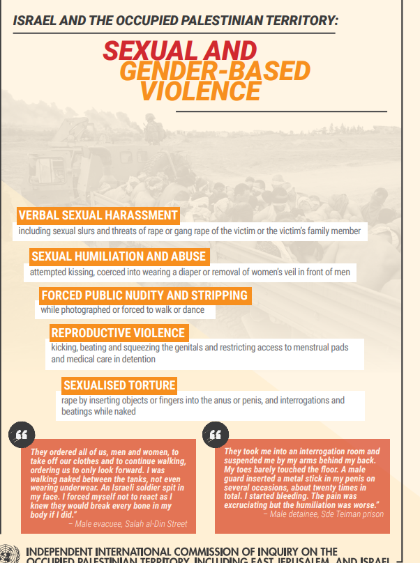 “The evidence collected by the Commission reveals a deplorable increase in sexual and gender-based violence,” said Navi Pillay, Chair of the Commission. “There is no escape from the conclusion that Israel has employed sexual and gender-based violence against Palestinians to terrorise them and perpetuate a system of oppression that undermines their right to self-determination.”