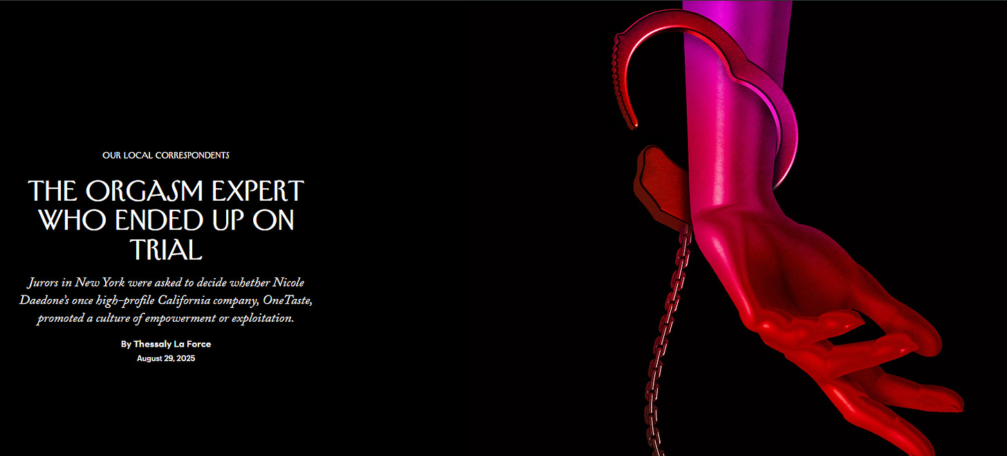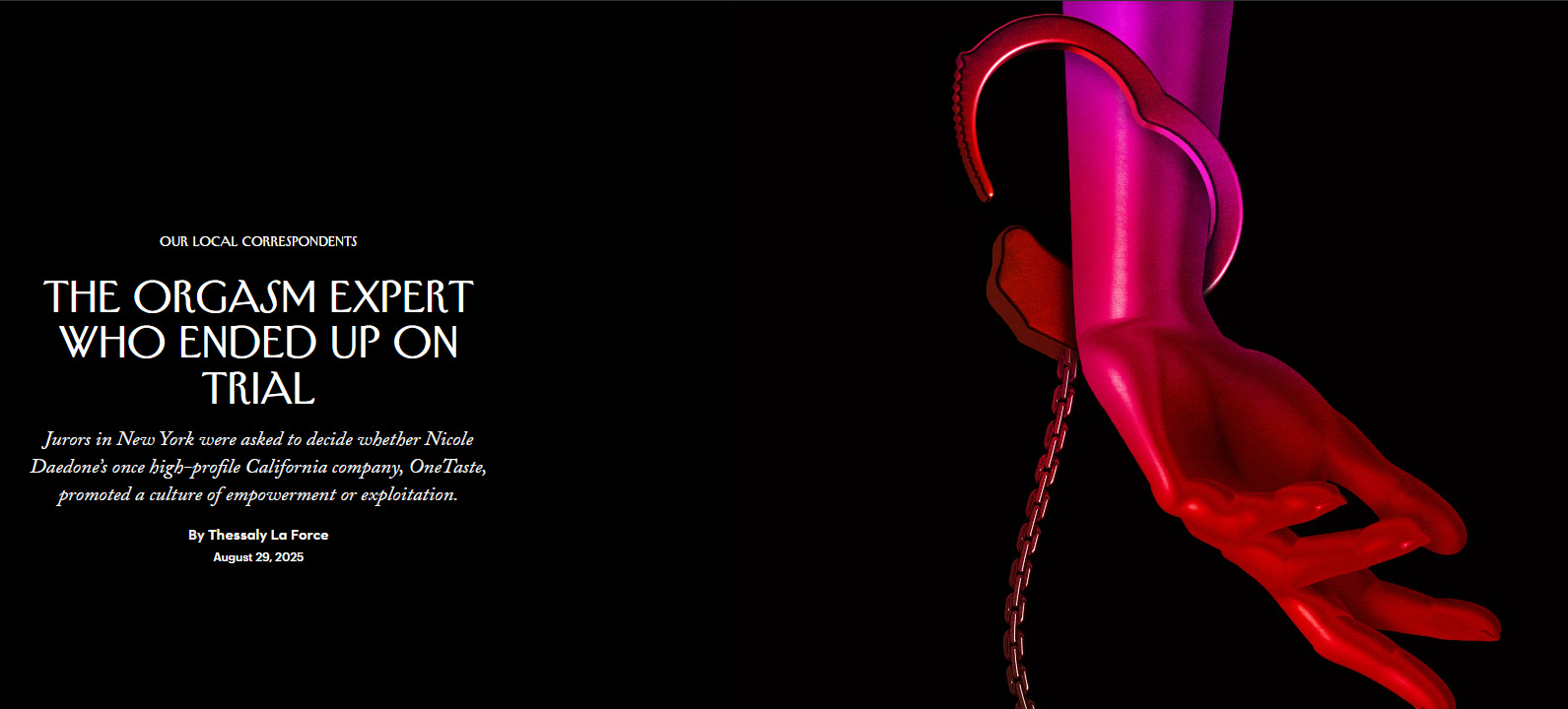 In those courses, Daedone was described as a “guru” who drew in followers with ideas borrowed from various religions, cults, and BDSM practices. She also espoused controversial ideas about sexual assault: In videos shown in court, she cast aspersions at rape victims and explained that her father, who she claims was a serial child molester, was not a bad person. Rather, she said, “He was so fourth dimensional that he couldn’t confine himself to the arbitrary laws of the third dimension,” using terms pulled from Alcoholics Anonymous, which Daedone adopted as part of the OneTaste vernacular.