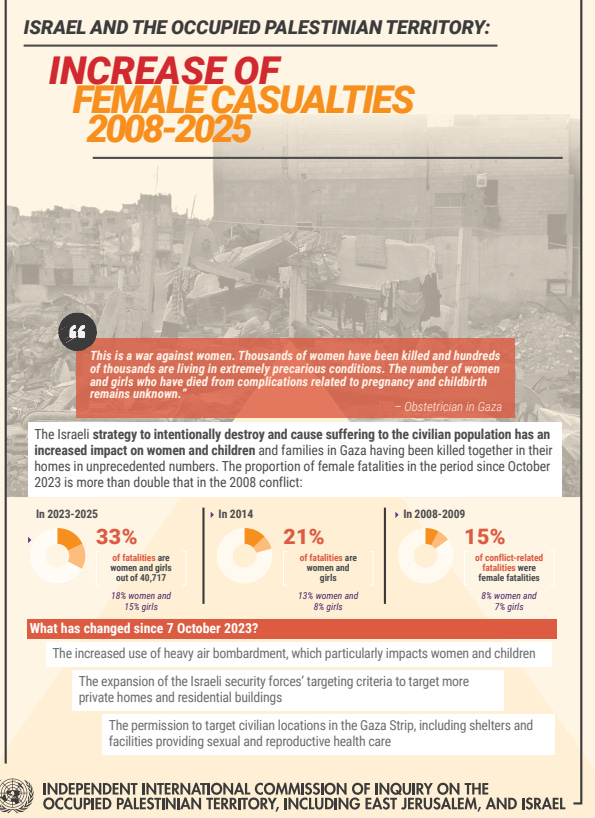 The Commission found an increasing proportion of female fatalities in Gaza, which have occurred at an unprecedented scale as a result of an Israeli strategy of deliberately targeting residential buildings and using heavy explosives in densely populated areas. The Commission also documented cases in which women and girls of all ages, including maternity patients, were targeted - acts that constitute the crime against humanity of murder and the war crime of wilful killing